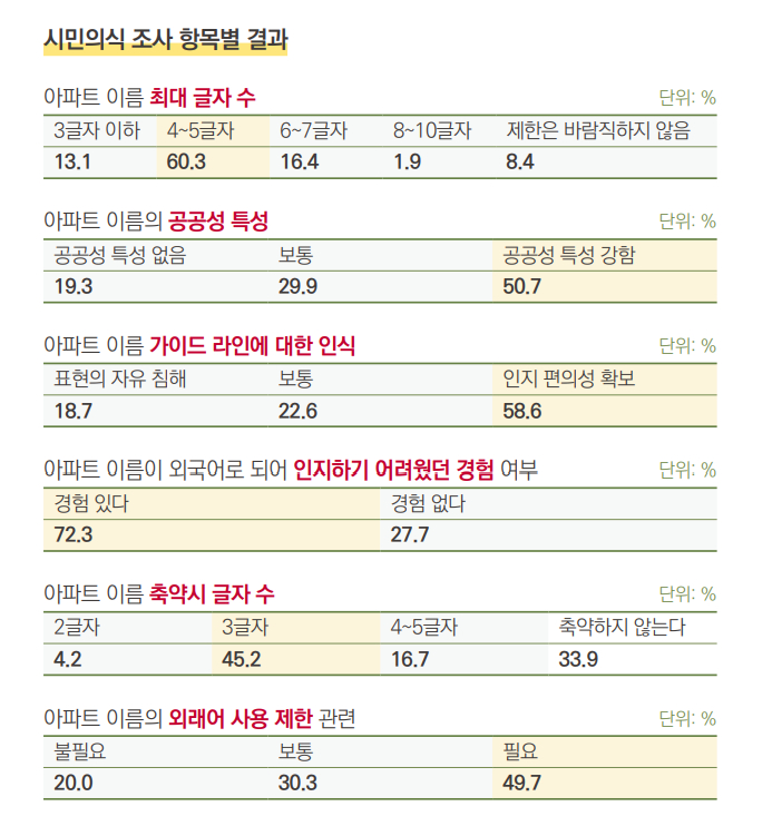 적정한 글자수로는 4~5글자(60.3%)를 꼽았다. 외래어 아파트 이름을 인지하기 어려웠단 응답(72.3%)도 대다수였다.