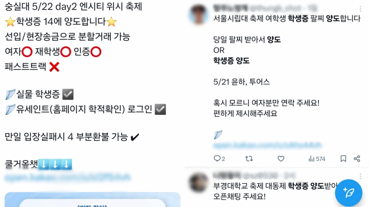 한 이용자는 "숭실대 5월22일 엔시티 위시, 학생증 14에 양도합니다"라고 했다. 서울 동작구 숭실대학교 축제에 유명 아이돌인 NCT가 오는데 이날 축제 입장이 재학생으로 제한되고, 입장을 위해 필요한 학생증을 14만원에 팔겠다는 뜻이다.