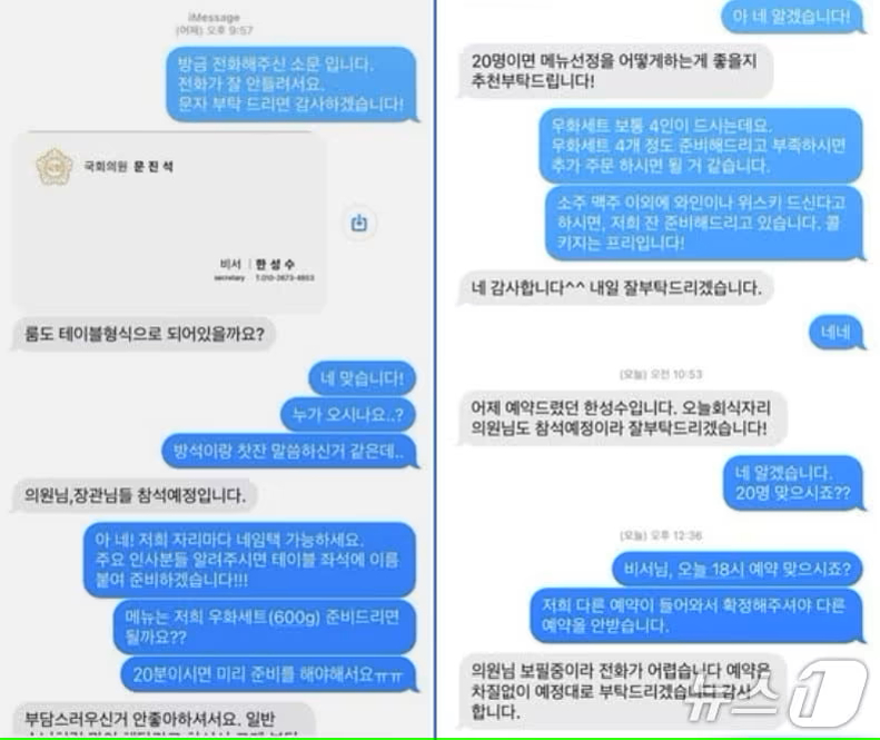 예약 당일인 14일에는 "어제 예약드렸다. 오늘 회식 자리에 의원님도 참석 예정이라 잘 부탁드린다"는 연락이 먼저 오기도 했다.