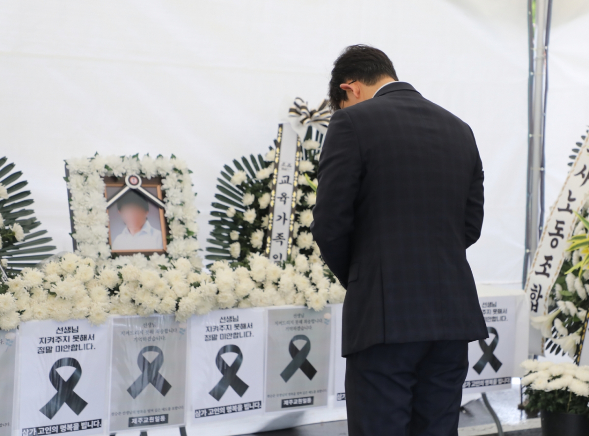 A씨는 지난 22일 새벽 제주 한 중학교 창고에서 숨진 채 발견됐다. 교무실에는 '학생 측 민원으로부터 힘들어했다'는 내용의 유서가 놓여 있었다.