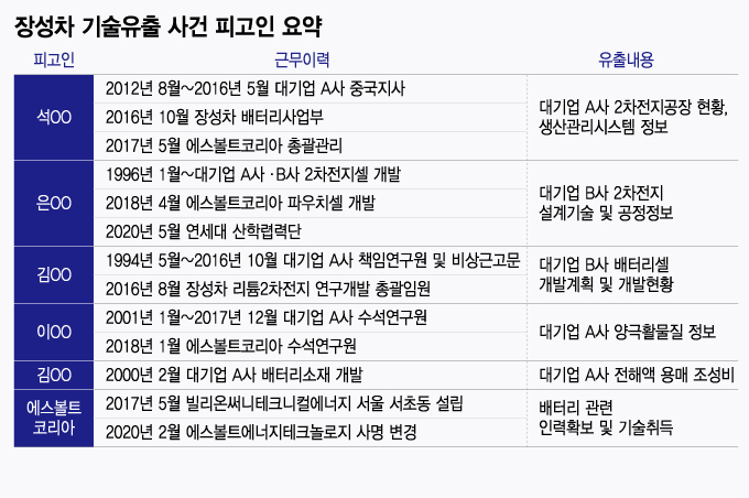 머니투데이가 확보한 공소장에 따르면 석씨는 한국계 중국 국적자로 2012년부터 중국 천징의 A사 사업장에서 제조혁신업무를 담당하다 2016년 10월 장성차 배터리사업부로 이직했다. 2017년 5월부터는 장성차 배터리계열사인 에스볼트의 한국지사 총괄관리를 맡았다.