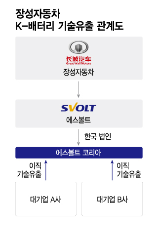 검찰이 대기업 A사와 B사 전직 임직원 5명을 2차전지 영업비밀을 유출한 혐의로 기소하면서 중국 장성자동차가 기술유출을 기획·지시한 정황을 공소장에 적시했다. 검찰은 중국 최대 SUV 제조사인 장성차가 국가핵심기술 확보를 위해 한국에 위장회사를 설립하고 인력을 포섭해 조직적으로 기술을 빼돌린 것으로 봤다.