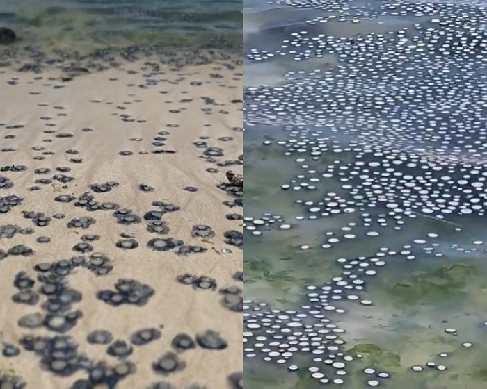 영상을 보면 해안가는 푸른색 작은 해파리 떼로 뒤덮여 있다. 모래사장에도 파도에 떠밀려온 해파리 사체가 다수 놓여 있었다.