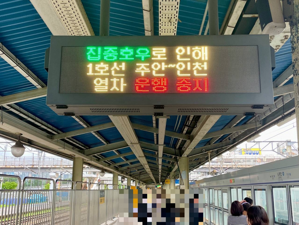 한국철도공사(코레일) 등에 따르면 1호선 주안~인천 구간이 운행 중지됐다가 비가 소강상태에 접어들며 운행을 재개하기도 했다. 정오경부터 인천1호선 박촌역 역사가 침수돼 열차가 무정차 통과했다. 박촌역은 이후 배수 작업을 마치고 오후 2시 15분부터 정상 운행했다.