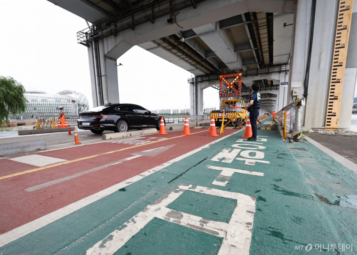 수도권에 호우가 쏟아진 여파로 14일 한강 수위가 상승하면서 잠수교 양방향 인도 통행이 통제됐다.