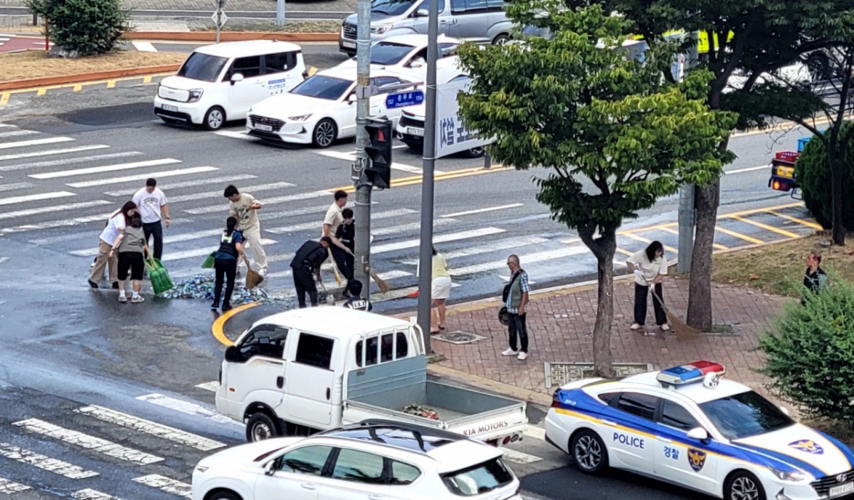 대전 한 도로를 달리던 트럭에서 상자가 떨어져 맥주병 수백개가 쏟아지는 사고가 발생했는데 시민들의 도움으로 2차 피해를 막았다.