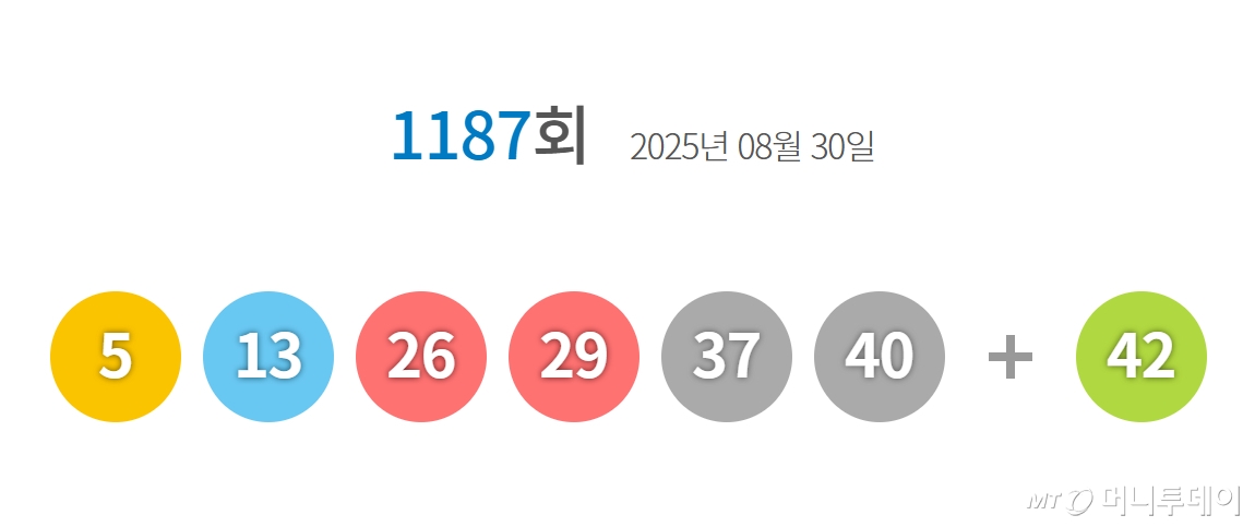 /사진=동행복권 1187회 로또 당첨번호는 '5·13·26·29·37·40'번이며 보너스 번호는 '42'번이다. 독자들의 PICK! 동서와 갈등→파혼 2번 아내..."조카는 남편 아이" 의심 충격 '고려대 얼짱' 걸그룹 멤버, 돌연 신내림..."10kg 빠지고 가족 죽는 꿈" "조갑경, 방송서 '아들 불륜' 나 몰라라…벌 받길" 전 며느리 분노 "갑자기 아기집 성장 멈춰"...서동주, 시험관 임신 끝 계류유산