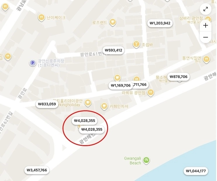 원룸, 투룸형 숙소 하루 가격은 최대 400만원을 넘었고, 150만원, 130만원, 115만원대 숙소도 쉽게 볼 수 있다. 이 일대 업소의 10월 평균 숙박비는 1박 20만~30만원에서 최대 40만원 수준이었다.