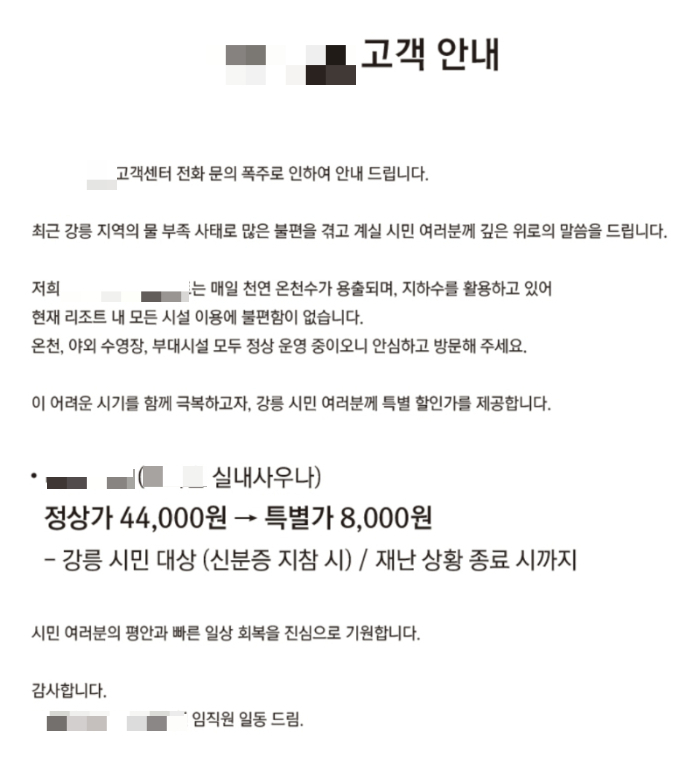 이 리조트는 "강릉 지역 물 부족 사태로 불편을 겪고 계신 시민 여러분께 깊은 위로의 말씀을 드린다"며 "어려운 시기를 함께 극복하고자 강릉 시민 여러분께 특별 할인가를 제공한다"고 밝혔다.