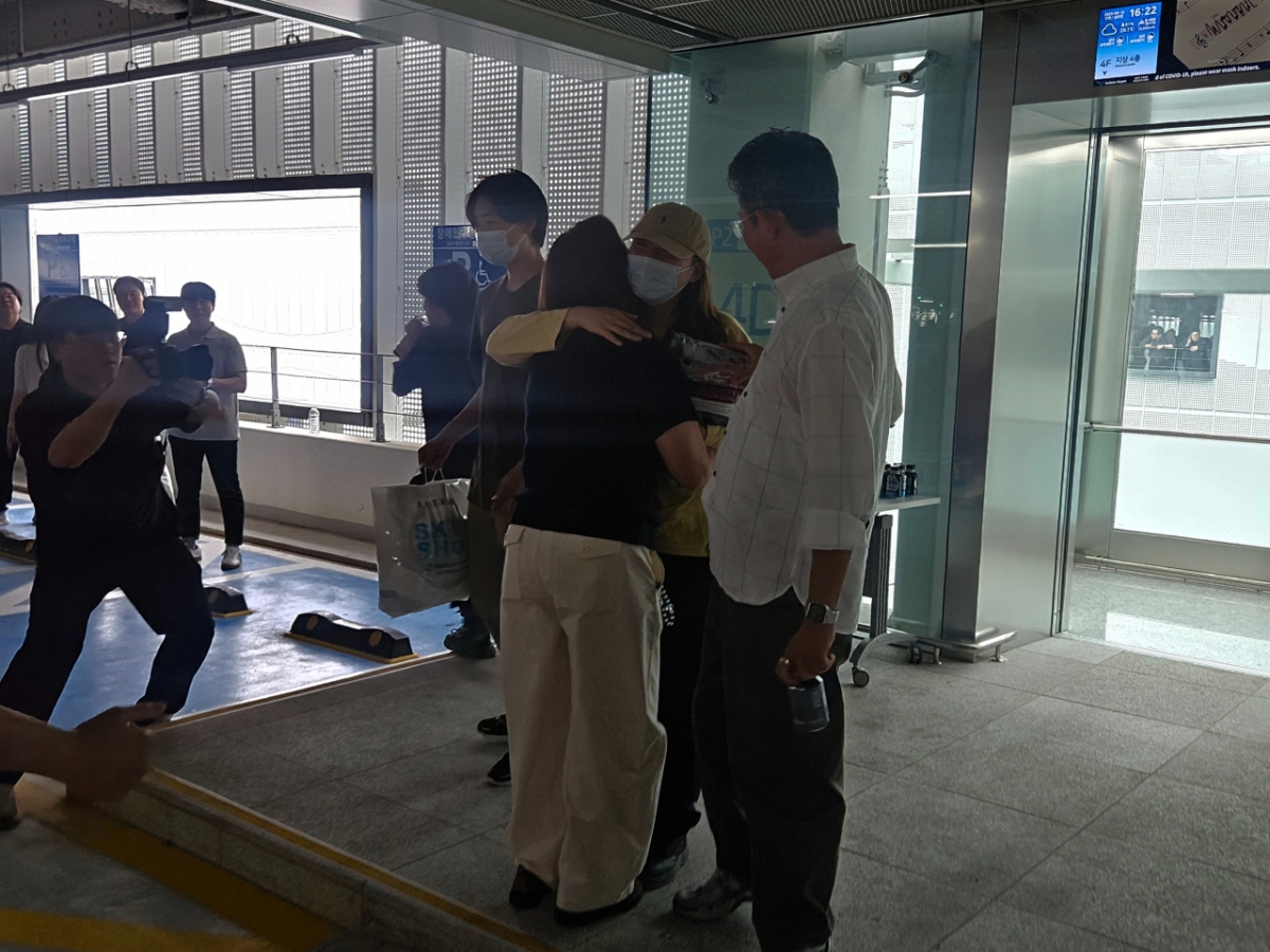 이날 첫 상봉은 오후 4시10분쯤 이뤄졌다. 귀국자들이 엘리베이터에서 모습을 드러내자 가족·회사 관계자 등은 박수를 치며 "고생 많았다", "보고 싶었다" 등 격려를 보냈다.