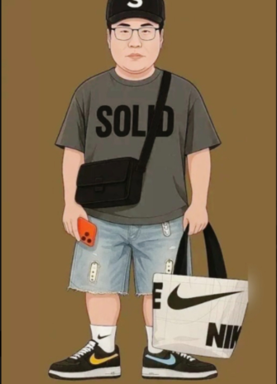 그림 속 남성은 볼캡 모자를 쓰고 영문 로고가 크게 박힌 티셔츠, 무릎까지 오는 청반바지를 입고 있다. 나이키 로고가 박힌 양말에 운동화도 신었다.