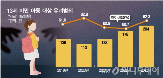 22일 대검찰청에 따르면 13세 미만 아동 대상 유괴범죄는 2019년 138건에서 2023년 204건으로 48% 급증했다. 피해자 10명 중 6명이 여아였다. 초등학교 하교시간에 해당하는 낮 12시부터 오후 6시까지 발생한 범죄가 잦았다.