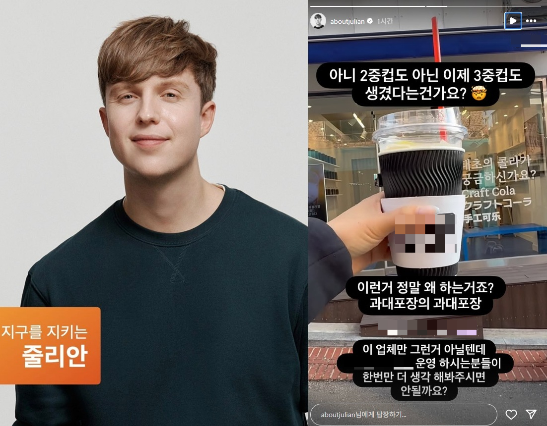 앞서 줄리안은 지난 22일 SNS에 한 콜라 가게 일회용컵 사진과 함께 "이제 2중컵도 아닌 3중컵도 생겼다는 건가. 이런 거 정말 왜 하나. 과대포장의 과대포장. 운영하는 분들이 한 번 더 생각하면 안 되나"라는 글을 올렸다.
