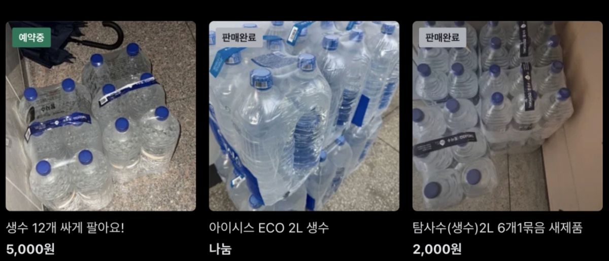 2일 한 중고 거래 플랫폼에는 생수 판매 글이 여럿 올라와 있다.