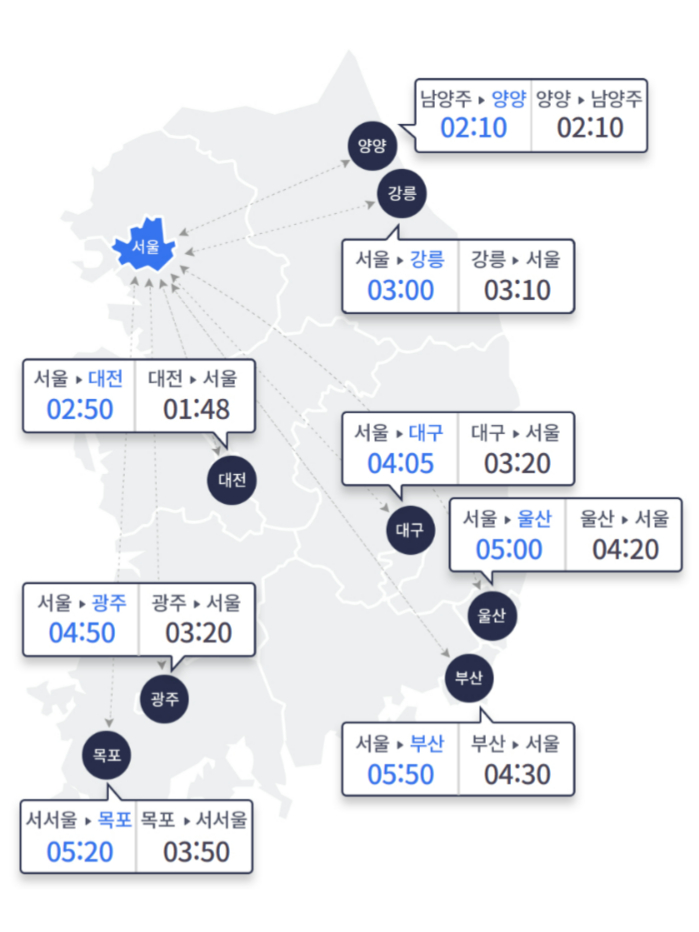 서서울에서 목포는 5시간20분, 경기 남양주에서 양양은 2시간10분 소요될 것으로 관측됐다.