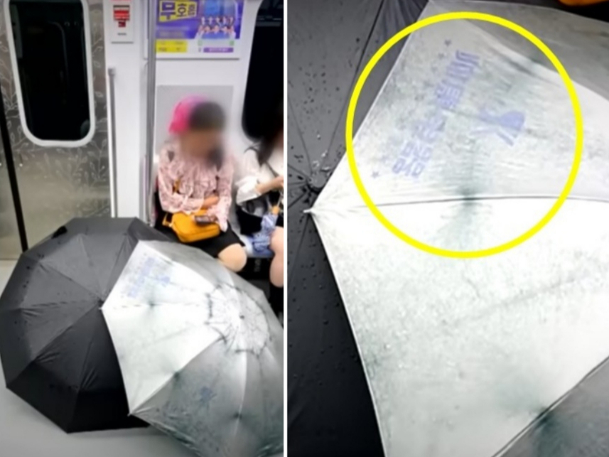 사진에는 지하철 임산부 배려석에 앉은 여성의 모습이 담겼다. 이 여성은 좌석 앞에 우산 2개를 펼쳐 말리고 있었다. 우산에는 중국어가 쓰여 있었다.