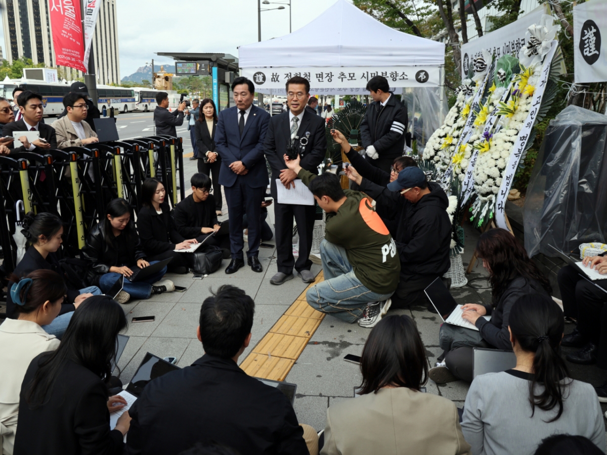 숨진 경기 양평군청 공무원 A씨(50대)의 변호인 박경호 변호사는 14일 서울 종로구 특검팀 사무실 앞에 설치된 A씨의 분향소 앞에서 기자회견을 열어 직권남용·허위공문서 작성·가혹행위 등의 혐의로 특검팀 수사관들을 고발하겠다고 예고했다.