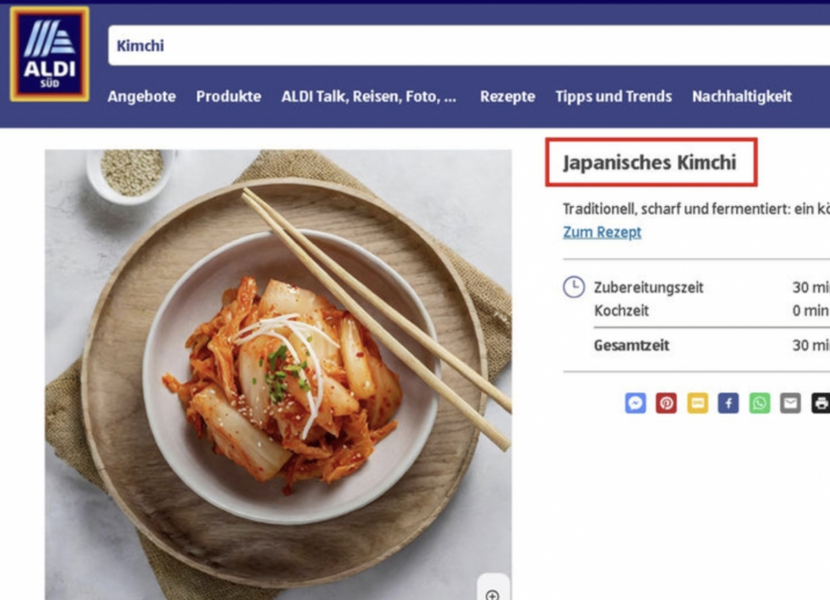알디 자사 홈페이지를 보면 김치 레시피를 알려주면서 'Japanisches Kimchi(일본 김치)'로 소개하고 있다.