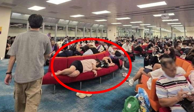 비행기 연착으로 많은 승객들이 대기 중이던 해외 공항에서 '한국인 모녀'가 벤치에 누워 자는 모습이 공개돼 논란이 일고 있다.