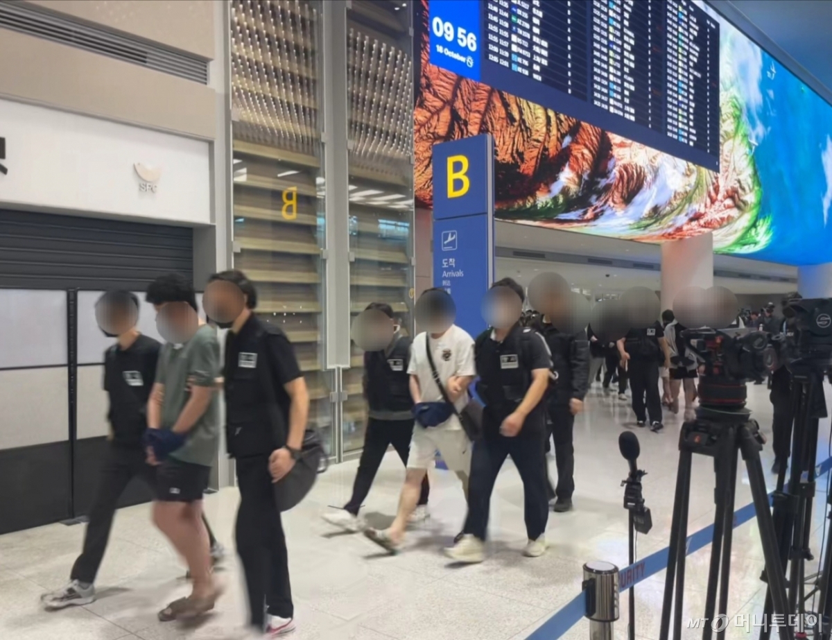 캄보디아 송환자 64명이 수속 후 수갑을 찬 채 인천국제공항 입국장을 나왔다.