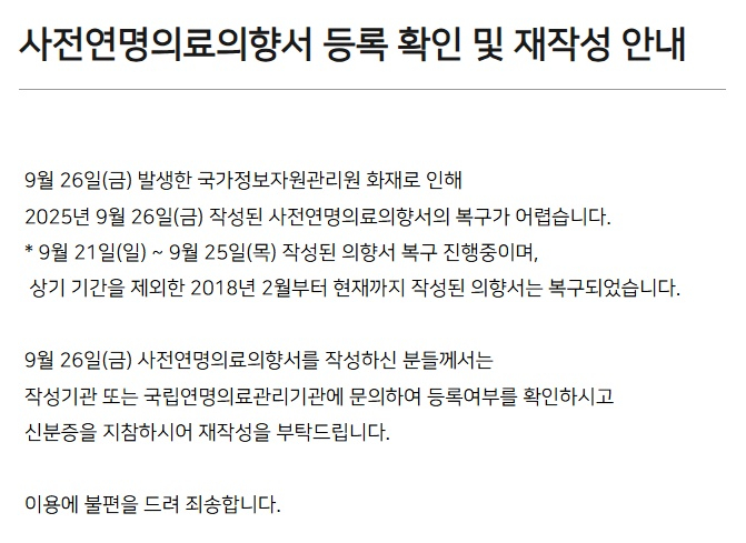 복지부는 "9월 21~25일 연명의료정보처리시스템의 사전연명의료의향서 데이터는 복구 진행 중"이라며 "9월 26일 자 데이터도 최대한 재등록 될 수 있도록 하겠다"고 밝혔다.