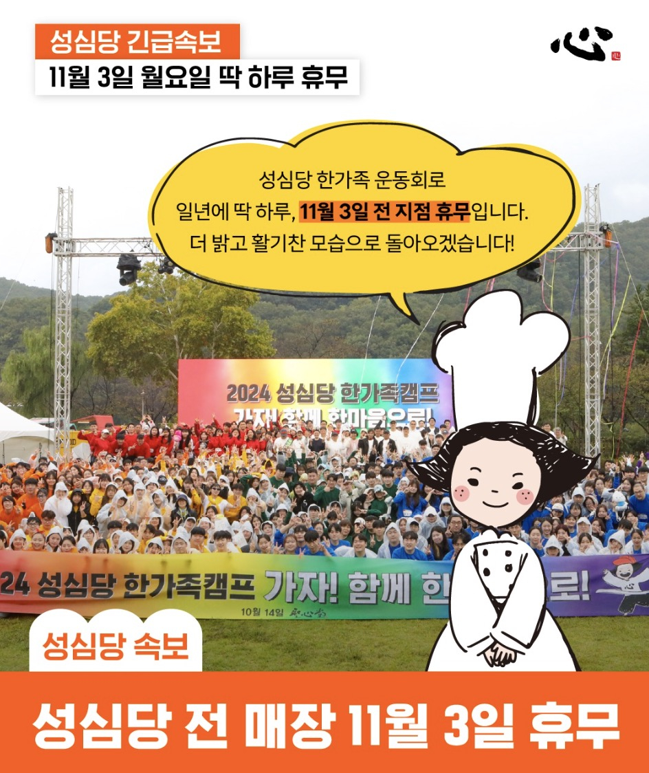 성심당은 최근 SNS(소셜미디어)에 "긴급 속보입니다. 성심당 전 매장이 11월 3일 월요일, 단 하루! 한가족 운동회로 쉬어갑니다"라며 전 매장 휴무 소식을 알렸다. 당일에는 성심당 전용 주차장인 성심당 문화원 주차장도 운영하지 않는다.