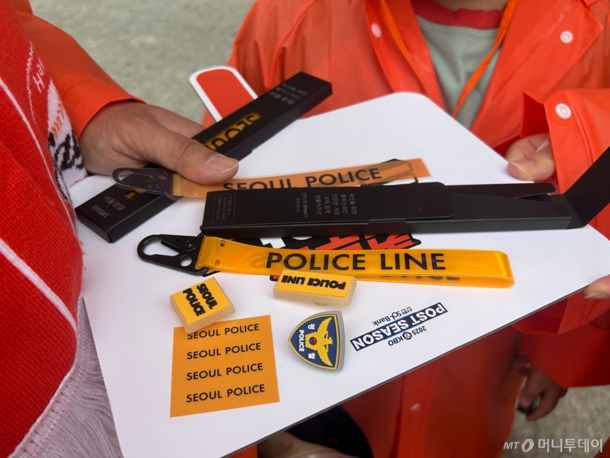'2025 KBO(한국야구위원회) 한국시리즈' 1차전이 열린 26일 서울 잠실야구장 1-7 출입문 앞에는 경찰 홍보부스가 꾸려졌다. 서울경찰청 소속 10개 경찰서 홍보담당자들은 '보이스피싱 예방! 우리 함께해요!'라는 내용이 적힌 띠를 두르고 키링과 지비츠(신발 구멍에 꽂는 액세서리)를 야구팬들에게 나눠줬다.