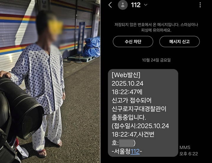 일반적인 상황이 아니라고 생각했던 A씨는 이름과 나이, 병원 위치를 물었다. 노인은 자신의 이름 빼고는 기억하지 못했다. A씨는 "횡설수설하는 모습을 보고 바로 112에 신고해 출동을 요청했다"고 말했다.