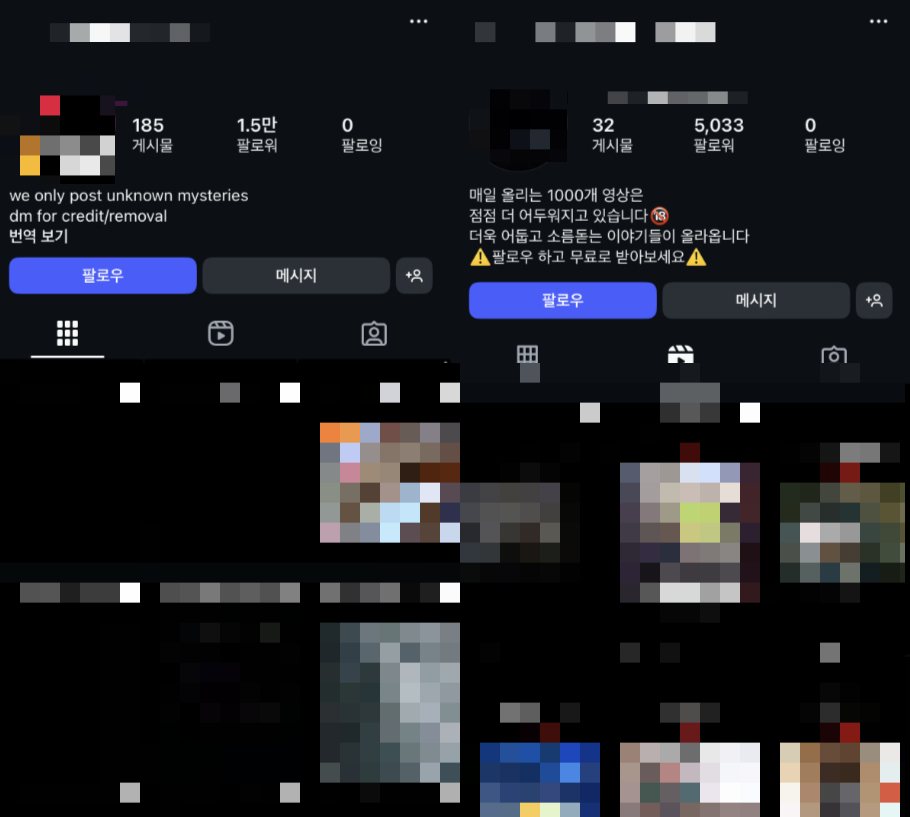 30일 머니투데이 취재를 종합하면 인스타그램에는 현재 국내외 사건·사고 영상을 게재하는 계정을 쉽게 발견할 수 있다. 계정주들은 사건·사고 관련 영상을 게재하며 '어두운 영상을 보고 싶다면 팔로우하라'고 이용자들을 끌어들였다. 팔로워를 수만명씩 보유한 계정도 있었다.