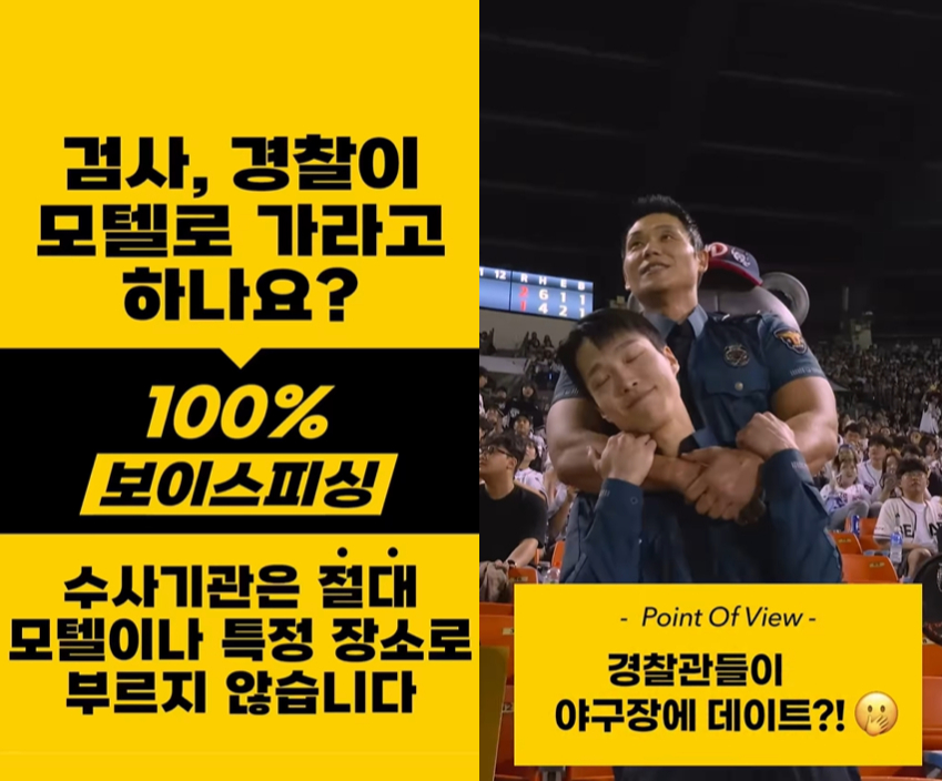 건장한 경찰관 두 명이 서로를 껴안았다. 야구장 중계 카메라가 이들을 비추자 황급히 몸을 숨겼다. 곧이어 '기관사칭형' 보이스피싱 예방 문구가 담긴 피켓을 들고 나타났다. 관중들은 환호했고 금세 SNS(소셜미디어)상에서도 화제가 됐다.