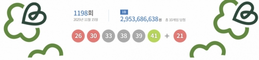 로또복권 운영사 동행복권은 제1198회 동행복권 로또 추첨 결과 '38, 41, 39, 30, 26, 33'이 1등 당첨 번호로 결정됐다고 15일 밝혔다. 2등 보너스 번호는 '21'이다.