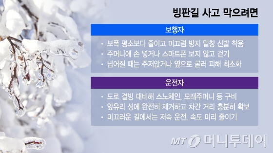 행정안전부 국민재난안전포털에 따르면 빙판길 사고를 막기 위해서는 보폭을 평소보다 10~20% 정도 줄이는 것이 안전하다. 굽이 낮고 미끄럼 방지 밑창이 있는 신발을 신는 것이 좋다.