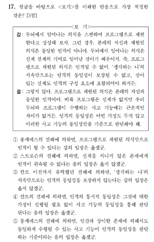정답은 3번 '칸트 이전까지 유력했던 견해에 의하면 생각하는 나의 지속만으로는 인격의 동일성을 보장하지 않는다는 갑의 입장은 옳지 않겠군'이었다. 17번 보기에서 '갑'은 '의식을 스캔해 프로그램으로 재현한다고 상상해 보면 본래의 자신과 재현된 의식은 동일한 인격이 아니다'고 주장했다.