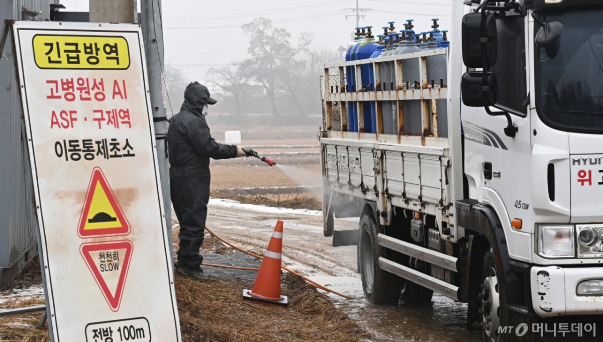 ![[여주=뉴시스] 김종택 기자 = 고병원성 조류인플루엔자(AI)가 발생한 경기도 여주시 흥천면 한 산란계 농장 인근 이동통제초소에서 6일 방역 관계자가 차량 방역작업을 하고 있다. 이번에 AI가 발생한 농장은 지난달 26일 발생한 농장과 직선거리로 600m 떨어진 곳으로 방역당국은 발생 농장 반경 10km 이내 25개 농장의 가금류 260만 마리에 대해 이동을 제한하는 등 방역을 강화하고 있다. 사진은 기사 내용과 관련 없음. 2025.01.06. jtk@newsis.com /사진=김종택](https://thumb.mt.co.kr/cdn-cgi/image/f=avif/21/2025/11/2025111919192674497_1.jpg)