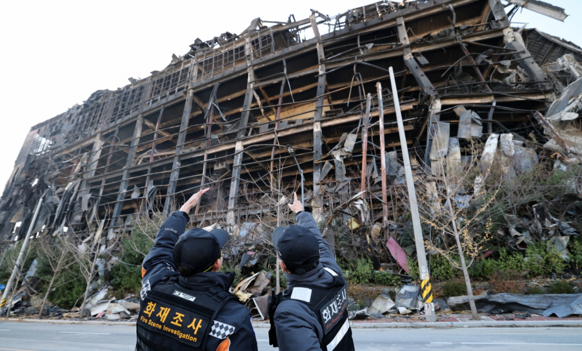 대형 화재로 사실상 전소된 충남 천안 이랜드 물류센터에 추가 붕괴 위험이 있어 현장 감식에 어려움을 겪었다.