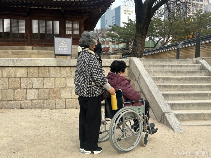 같은 날 휠체어를 타고 덕수궁 관람에 나선 기자 역시 모녀처럼 당혹스러움의 연속이었다. 시청역에서 빠져나오는 과정부터 쉽지 않았다. 역 출구는 1번부터 12번까지 있었으나 엘리베이터가 설치된 곳은 2번과 9번 출구였다. 2번 출구는 계단 탓에 휠체어를 타고 이용할 수 없었다.