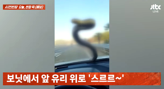 주행 중인 차량에서 몸길이 2m(미터) 가량으로 추정되는 구렁이가 나타났다는 제보 영상이 화제다.