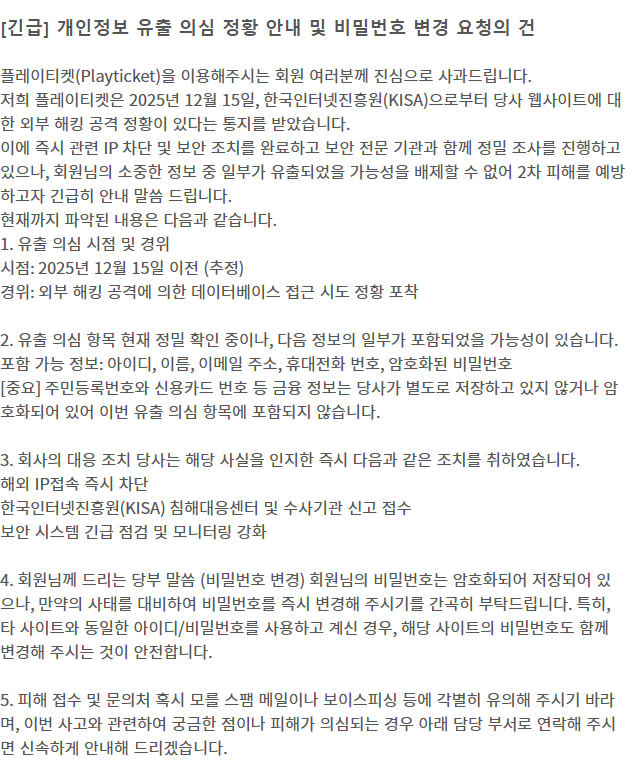 현재 플레이티켓이 파악한 외부 유출 의식 항목은 △아이디 △이름 △이메일 주소 △휴대전화 번호 △비밀번호 등이다. 주민등록번호와 신용카드 번호 등 금융 정보는 플레이티켓이 별도 저장하지 않거나 암호화돼 유출 의심 항목에 포함되지 않았다고 공지됐다.