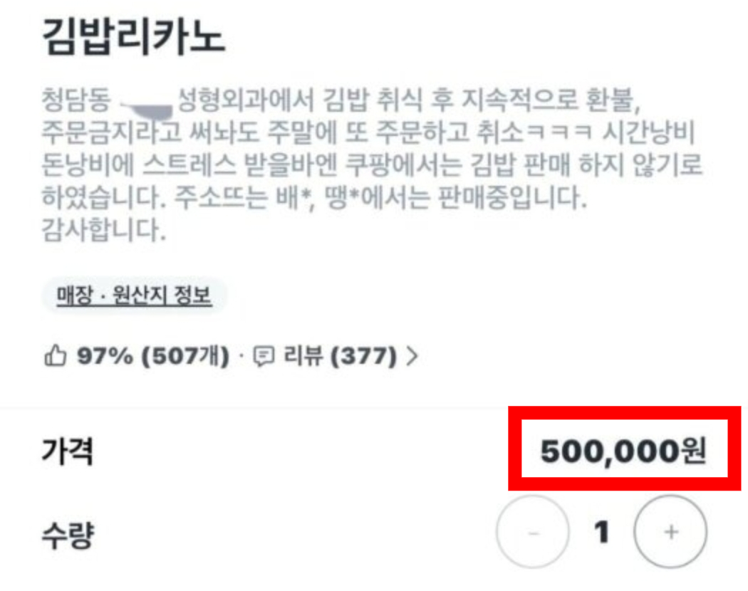 앞서 OO성형외과 인근에서 한 김밥집을 운영하는 자영업자는 배달 플랫폼 쿠팡이츠에 김밥 1줄에 라지 사이즈 커피 1잔으로 구성된 '김밥리카노' 메뉴 판매 가격을 50만원으로 설정한 바 있다. 설명란에는 "청담동 OO성형외과에서 김밥 취식 후 지속적으로 환불. 주문금지라고 써놔도 주말에 또 주문하고 취소. 시간 낭비, 돈 낭비에 스트레스 받을 바엔 쿠팡이츠에서는 김밥 판매하지 않기로 했다"고 적었다.