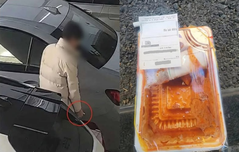 사진엔 한 남성이 차량 앞좌석에서 꺼낸 하얀색 플라스틱 용기를 들고 차량 뒤쪽으로 다가가 몰래 버리는 모습이 담겼다. 이 남성이 떠난 자리엔 비닐 포장이 반 정도 벗겨진 용기에 떡볶이가 담긴 채 덩그러니 놓여 있었다.