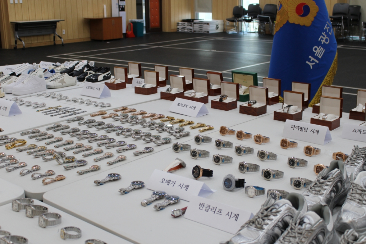 경찰은 지난 2024년 11월과 지난달 이들이 운영하는 사무실 2곳을 압수수색해 가짜 명품 의류 412점과 가짜 명품 시계 258점, 명품 운동화 50점 등 약 77억원 규모의 의류를 압수했다.