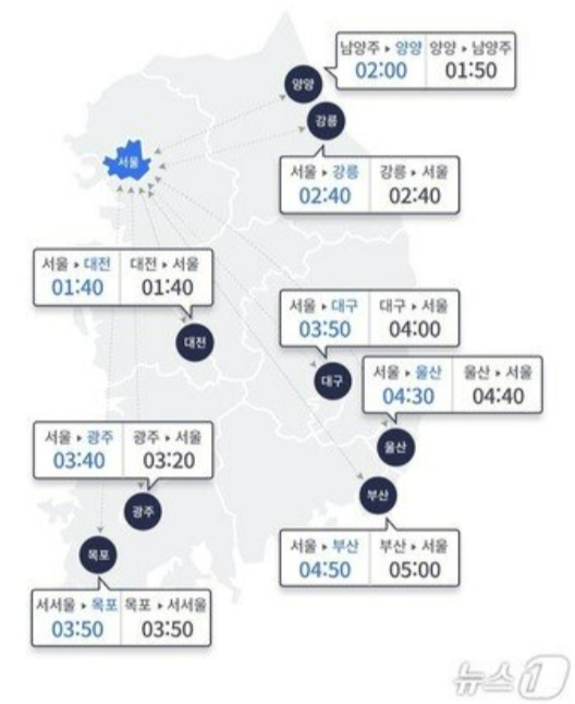 같은 시각 지방에서 서울까지는 △부산 5시간 △울산 4시간40분 △대구 4시간 △강릉 2시간40분 △양양 1시간50분(남양주 출발) △대전 1시간40분 △광주 3시간20분 △목포 3시간50분이다.