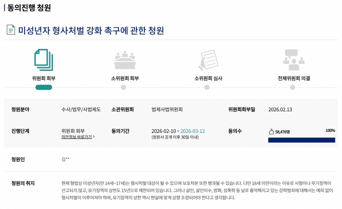 지난 10일 국회전자청원 홈페이지에 올라온 미성년자 형사처벌 강화 촉구에 관한 국민동의청원은 사흘 만인 지난 13일 동의자 수 5만명을 넘어섰다. 14일 오후 2시30분 기준 동의 수는 5만8425명을 기록했다.