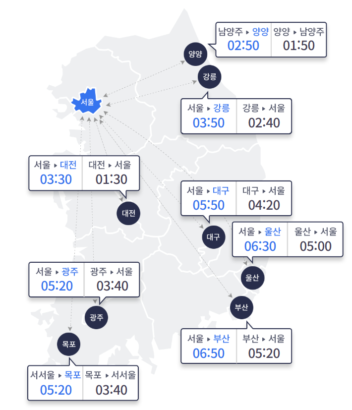 서울에서 주요 도시별 소요 시간은 △울산 6시간30분 △대구 5시간50분 △목포 5시간20분 △광주 5시간20분 △강릉 3시간50분 △대전 3시간40분 등이다.