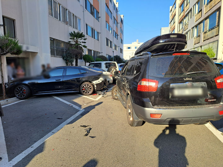 부산 한 아파트에서 70대가 몰던 차가 주차돼 있던 차 여러 대를 연속 추돌하는 사고가 발생했다.