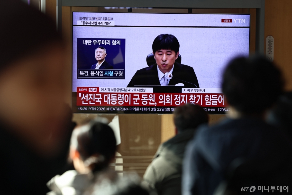 19일 오후 서울역 대합실에 설치된 tv를 통해 윤석열 전 대통령의 내란 우두머리 혐의 1심 선고가 생중계 되고 있다. 2026.2.19/뉴스1 19일, 서울중앙지법 형사합의25부(부장판사 지귀연) 윤석열 전 대통령 내란 우두머리 등 혐의 선고공판 독자들의 PICK! 장윤정 모친 "'두 번 이혼' 딸, 제일 속상…연하 사위 원해" '암 투병' 박미선 만난 선우용여 "네가 딸, 가족은 설날 연락도 없어" "집·차·여자는 유지보수 해야"…안선영 발언에 누리꾼 '부글' "시부모 수발들면 30억 아파트 줄게"...30대 며느리는 거절