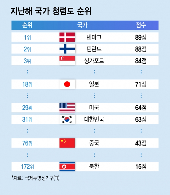 대한민국이 지난해 국가 청렴도 순위에서 31위를 기록했다. 점수로 보면 100점 만점에 63점을 받았다.