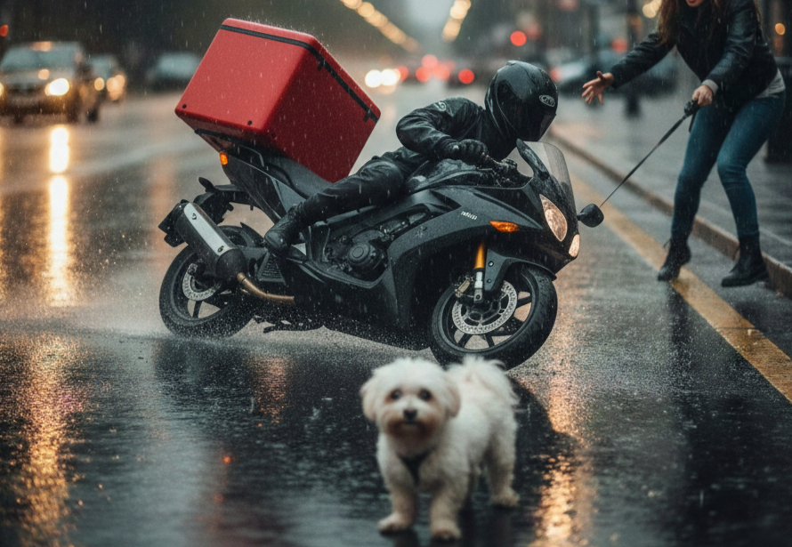 A씨는 당시 비가 내리고 있어 천천히 주행 중이었는데 인도에서 견주와 함께 걷고 있던 개가 갑자기 차도로 튀어나왔다. A씨는 이를 피하려다가 넘어졌다.