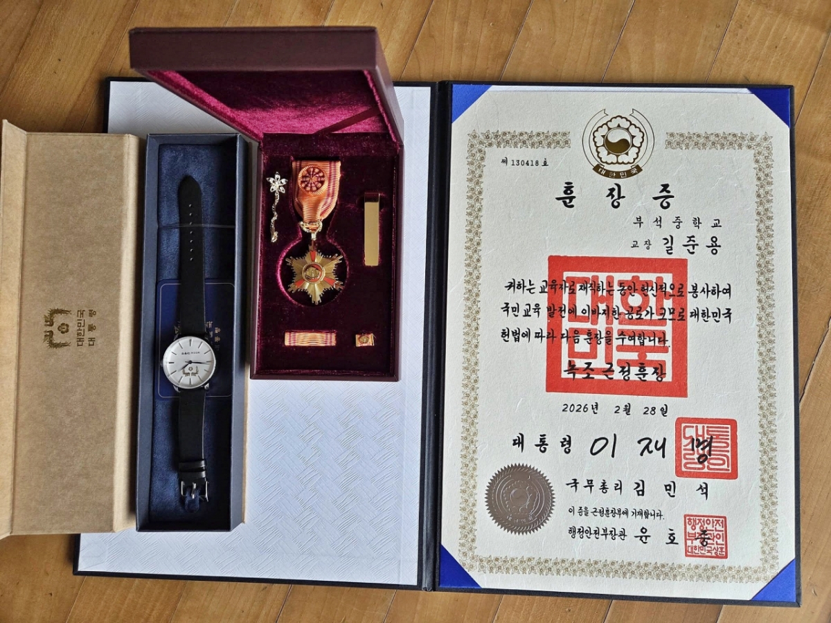 길준용 전 서산 부석중학교 교장은 최근 SNS(소셜미디어)에 "3년 전 정년퇴직할 때 거부했던 근정훈장을 충남교육청에서 받았다"며 훈장증 사진을 공개했다.