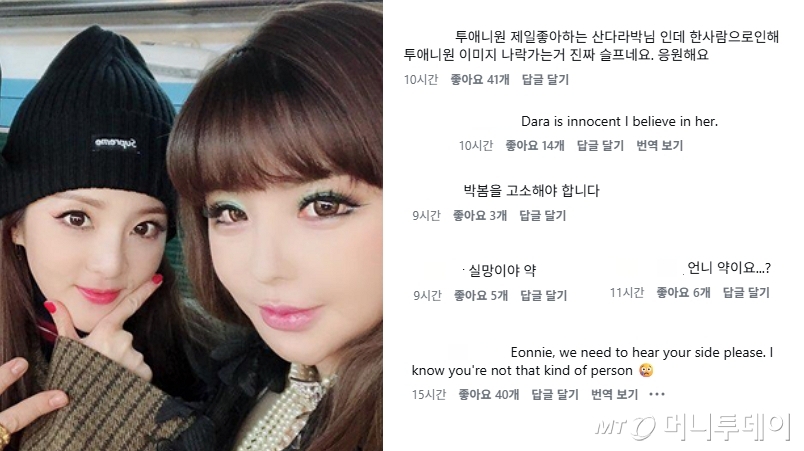 4일 확인 결과 산다라박 인스타그램에는 "실망이다. 약" "나는 산다라박 믿는다" "투애니원 이미지 나락 가는 거 슬프다" "박봄 고소해라" "진실이든 거짓이든 한동안 힘드시겠다. 일단 1순위는 손절" 등 국내외 누리꾼들의 댓글이 쏟아지고 있다.